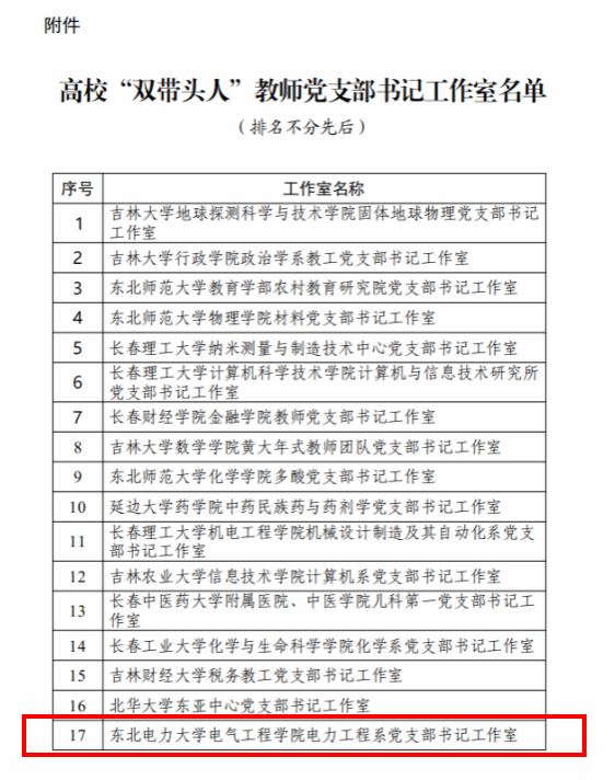 近日,吉林省委教育工作委员会公布了全省高校“双带头人”教师党支部书记工作室遴选名单,我校电气工程学院电力工程系党支部书记工作室成功入选。