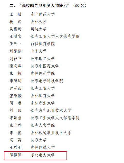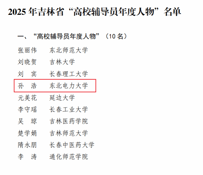 近日,吉林省教育厅2025年吉林省“高校辅导员年度人物”推选结果揭晓,我校辅导员孙浩老师获评2025年吉林省“高校辅导员年度人物”,辅导员陈恒阳老师获评吉林省“高校辅导员年度人物提名”。