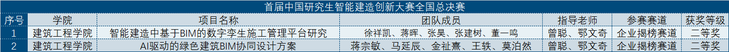 中国研究生智能建造创新大赛由中国学位与研究生教育学会和中国科协青少年科技中心共同主办,大赛自启动以来吸引了来自清华大学、东南大学、同济大学等225所高校及科研院所的1316支团队报名参赛。经过初赛评选,共有336支优秀队伍进入总决赛,我校建筑工程学院建研24级马延辰等同学的参赛作品为“AI驱动的绿色建筑BIM协同设计方案”、建研24级研究生张建树等同学的参赛作品为“智能建造中基于BIM的数字孪生施工管理平台研究”两个参赛项目分别从工程管理和城乡规划两个维度展现了智能建造技术的创新应用,充分体现了多学科交叉融合的创新优势。