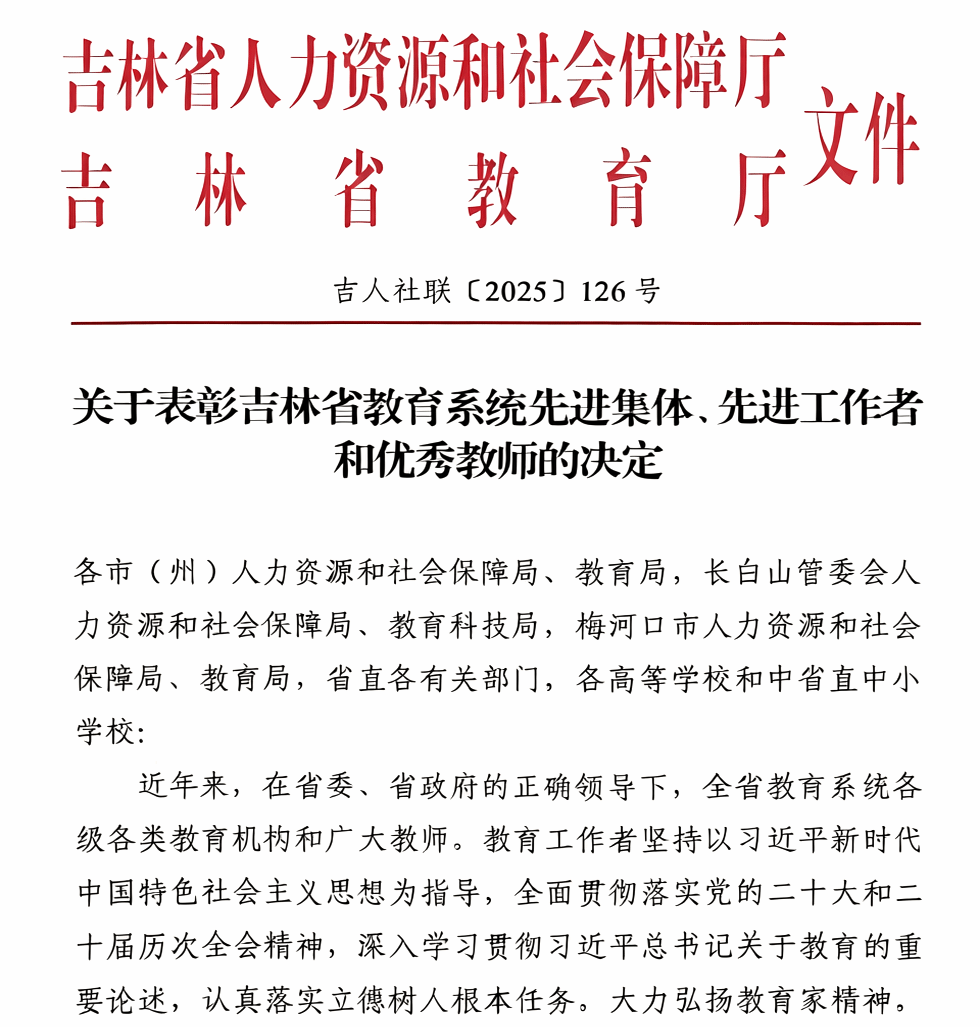 吉林省教育系统先进集体、先进工作者和优秀教师评选表彰工作旨在表彰在教育教学、科研创新、人才培养等方面做出突出贡献的集体和个人,弘扬尊师重教的良好风尚,激励广大教师和教育工作者不忘初心、立德树人。本次评选活动中,经学校党委推荐的3个候选对象均获得表彰。