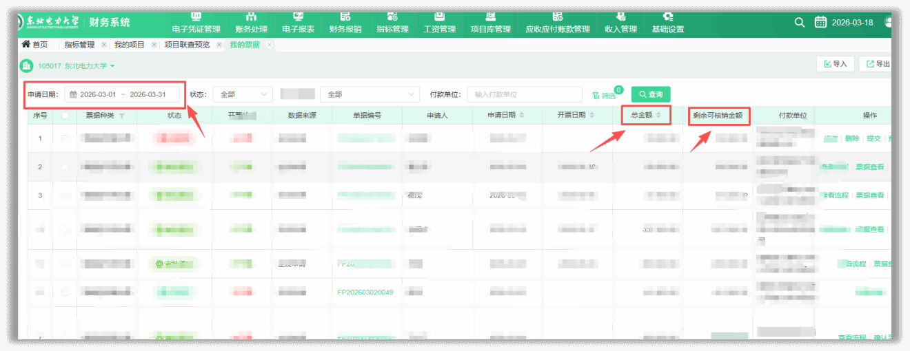 进入我的票据页面后可以在左上角的申请日期处取消日期筛选(默认显示当月预借的票据),即可查询截至目前全部的预借票据。其中剩余可核销金额栏金额的就是欠款的金额,请及时联系相关单位进行汇款。