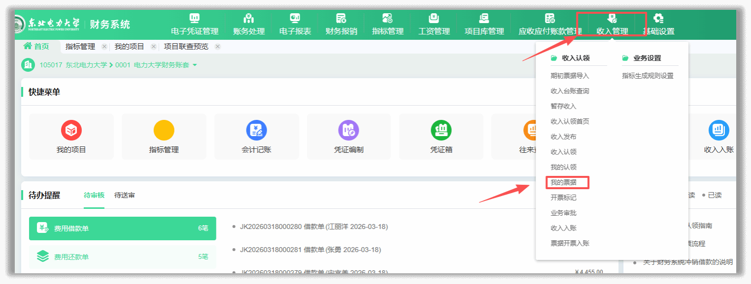 登录财务系统,在顶端标题行点击收入管理→我的票据→查询已经预借的发票。